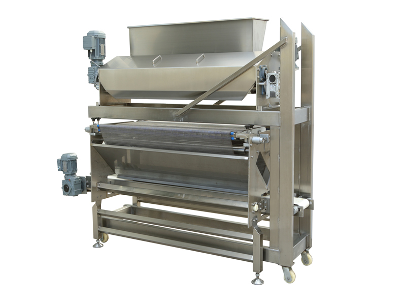該設備應用于將固體顆粒或者粉狀調味料,鹽,糖,芝麻及果仁片等撒布在面皮或則餅干上。回收機回收多余的撒布物料循環(huán)利用。